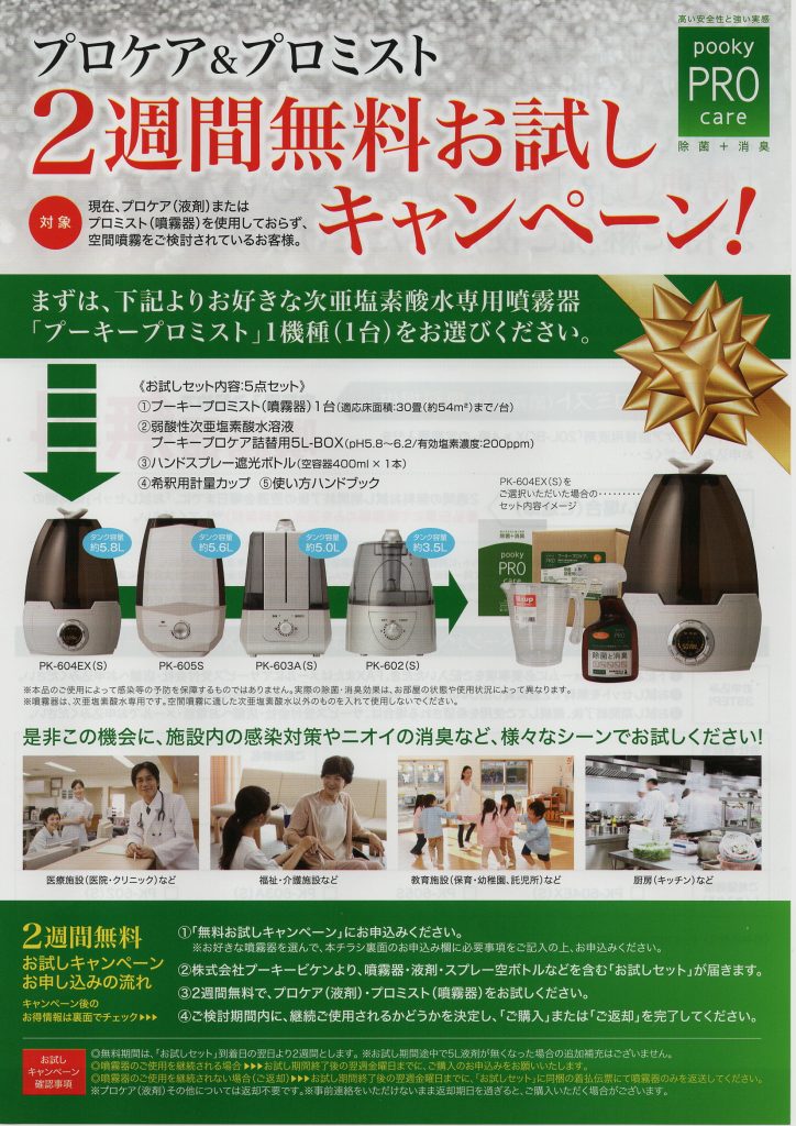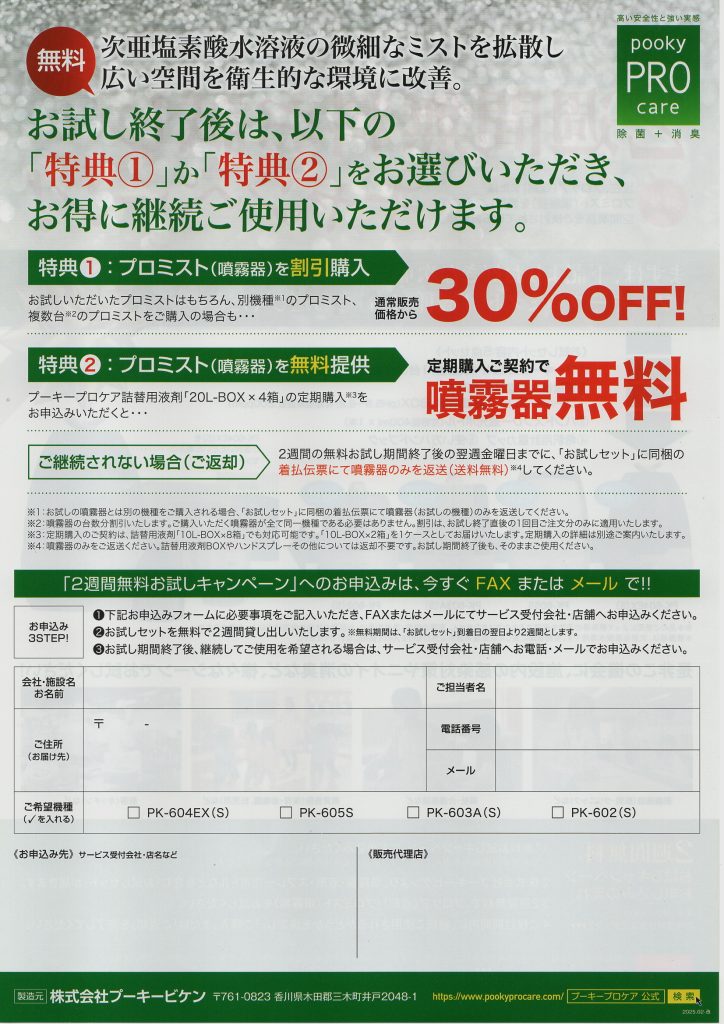 - プーキープロミスト(噴霧器)1台(対応面積:約30畳・約54㎡まで)